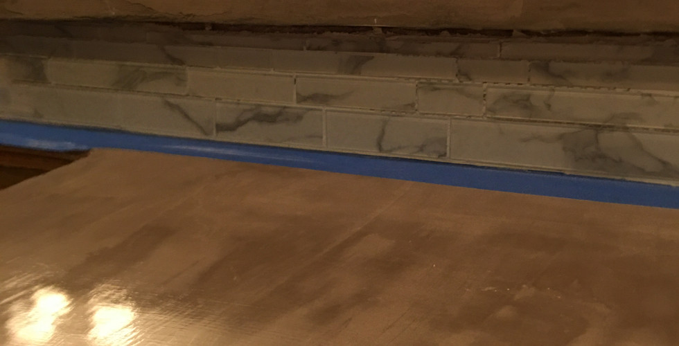 First, we had removed the old backsplash which we originally thought we could preserve the old drywall. Nope, I was way wrong. I am no drywall expert at all, so this was a trick. We cut out the old dry wall and made sure the corners were square and the edges smooth. I replaced the drywall with dura rock from Home Depot, screwed it in place, taped it and mudded it. (Remember we did this before the counter top was completed because we wanted all the sanding to be finished ASAP.